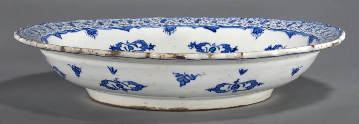 شكلت بالدولاب، وغطي ببطانة بيضاء، ثم رسم عليه بلون أزرق كوبالتي، وُطلي بسائل تزجيج شفاف عديم اللون.