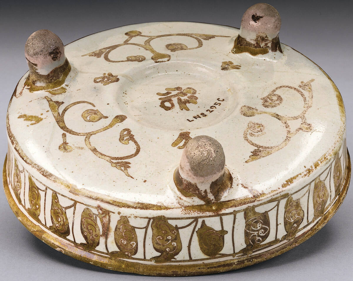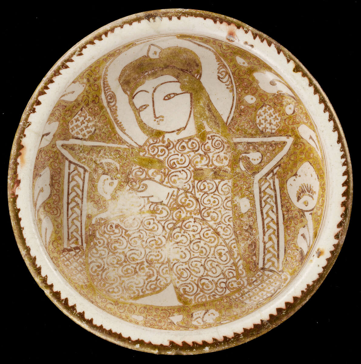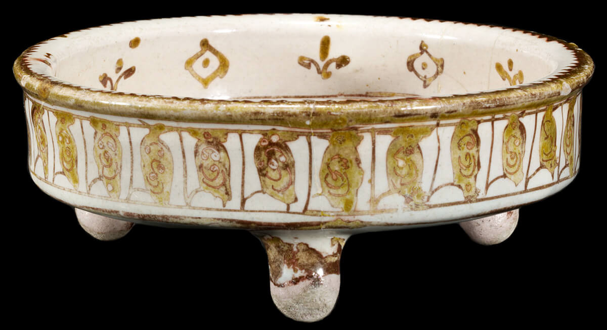 سلطانية من الفخار، رسمت عليها أنصاف مرواح نخيلية على شكل دوامة، بألوان البريق المعدني، الأحمر النحاسي والأخضر الزيتوني.