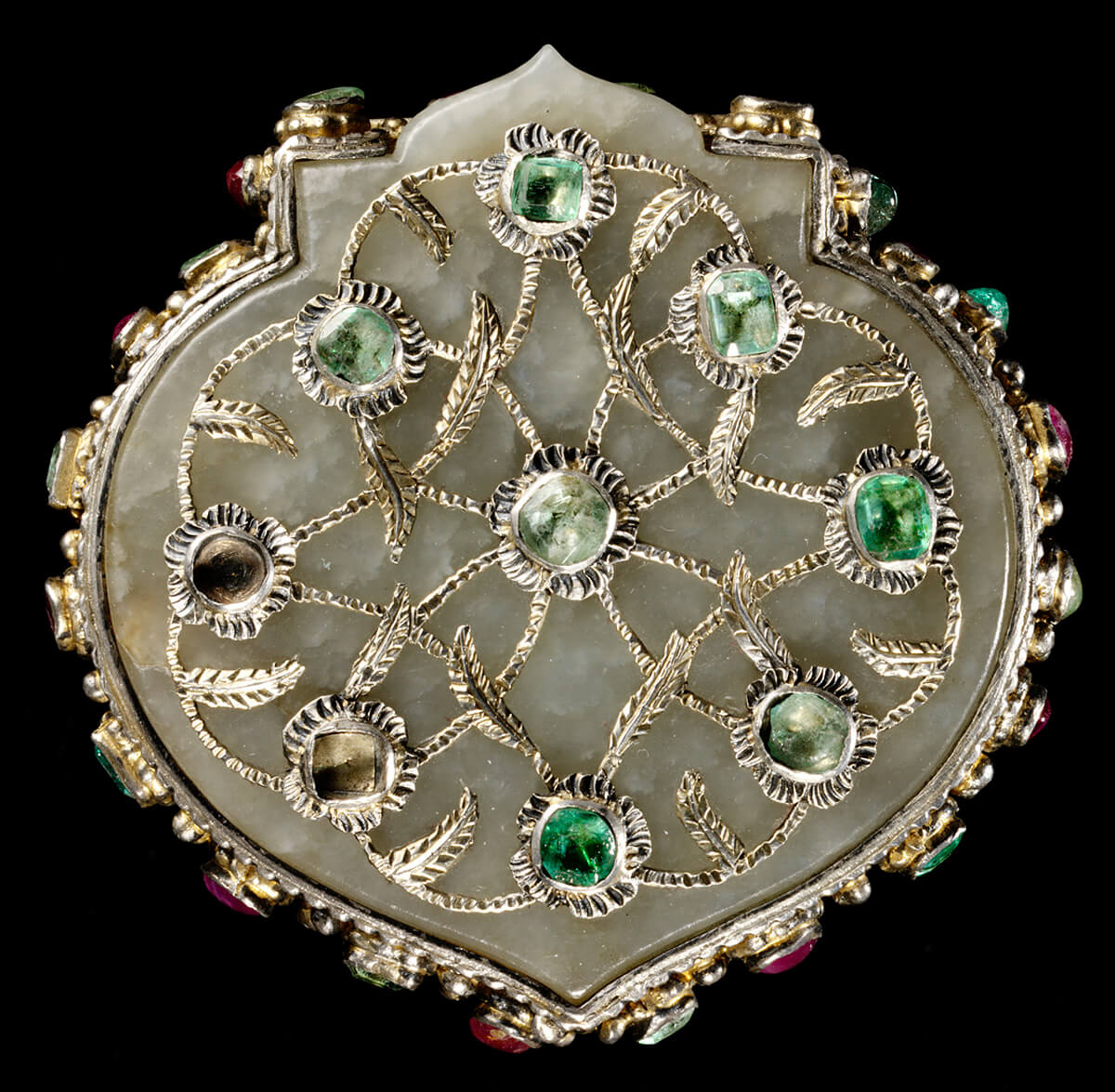 بدن العلبة مصنوع من الفضة، ومزخرف بزخارف بارزة، ومكَّفت بالذهب؛ وسطح الغطاء من صفيحة من حجر اليشب، تم دقه وحفُره وشحُذه وصقله بأدوات الصاغة، ثم تكفيته بالذهب وترصيعه بالأحجار الكريمة.