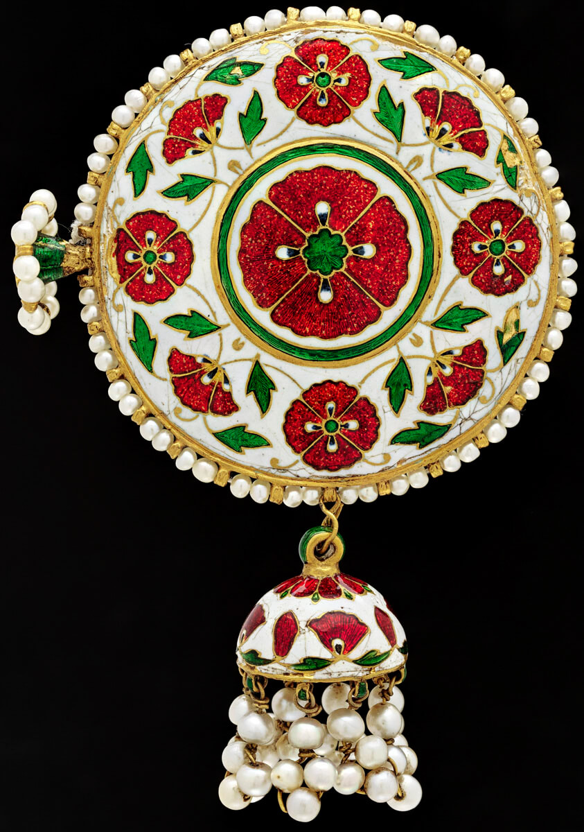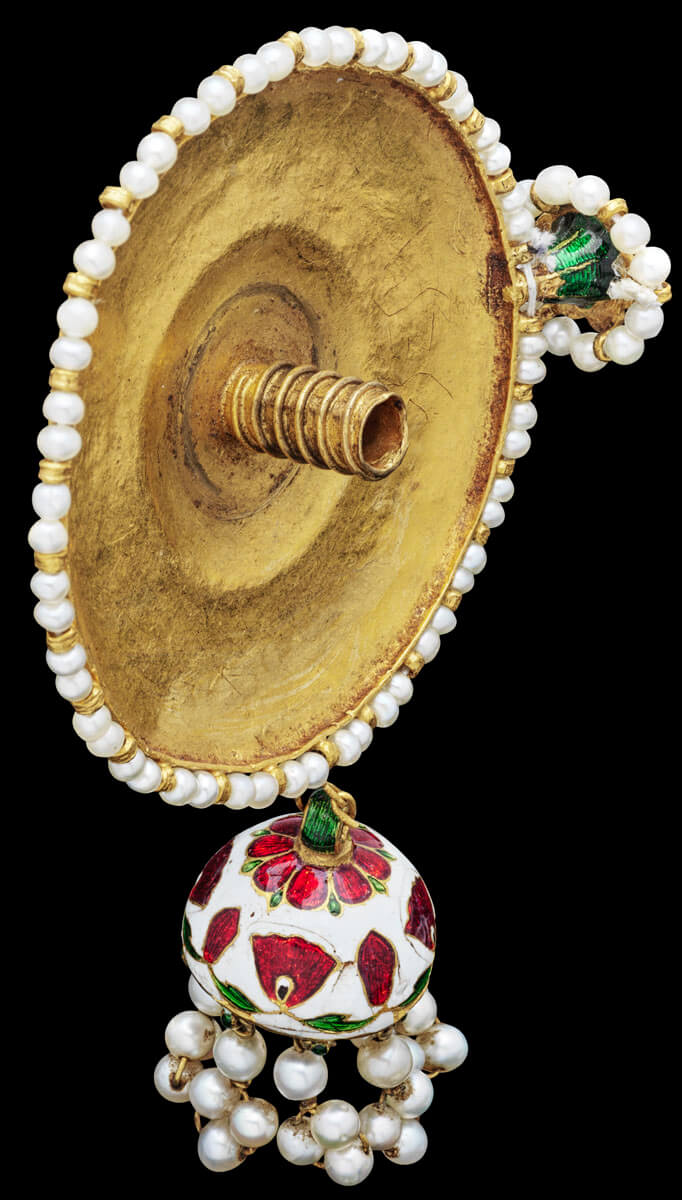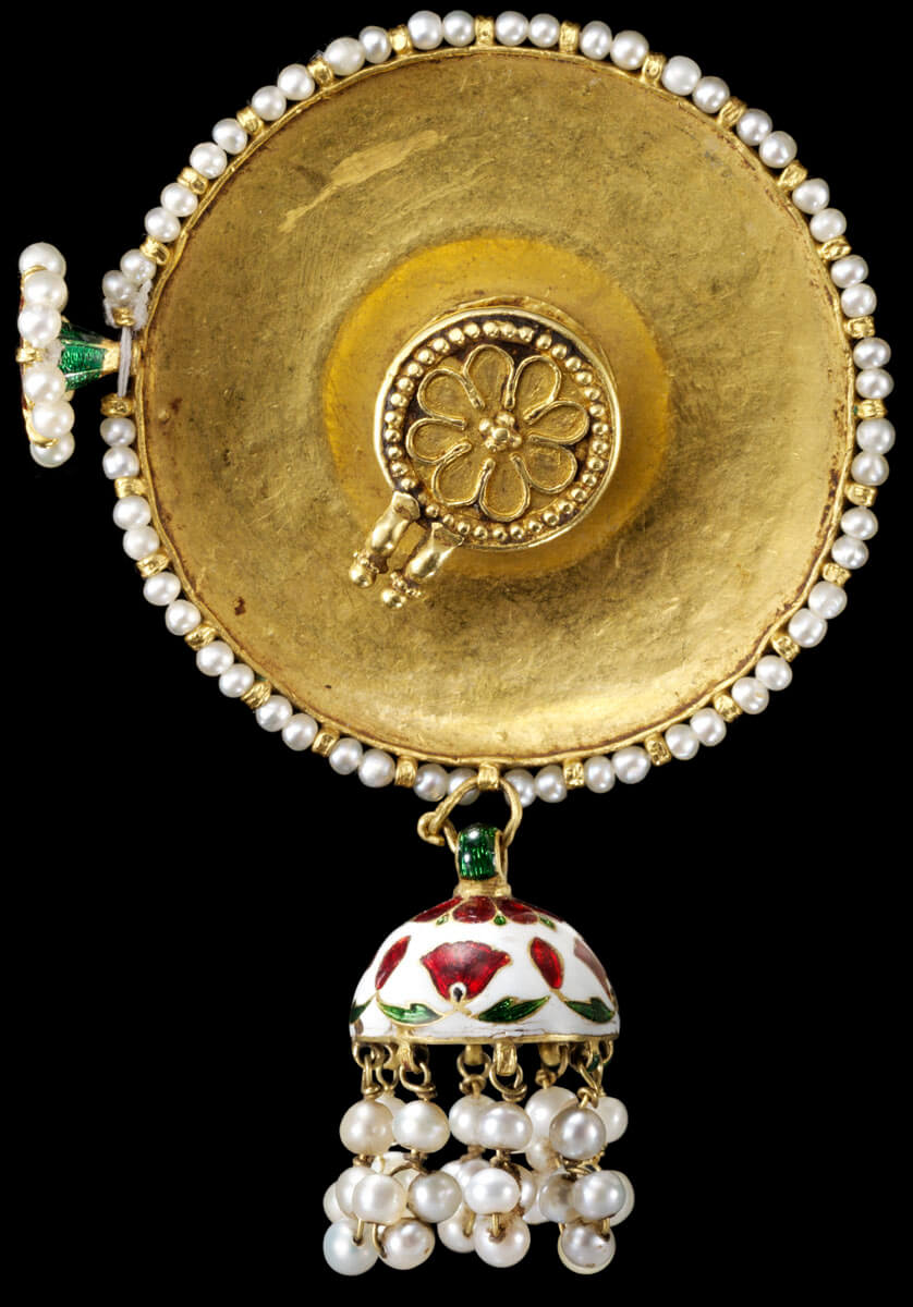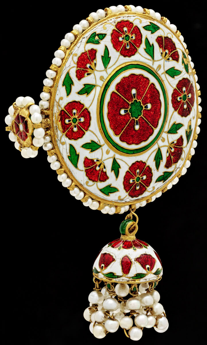 مصنوع من الذهب، ومطلي بالمينا، وخيوط من الذهب تنتظم فيها حبات من اللؤلؤ.