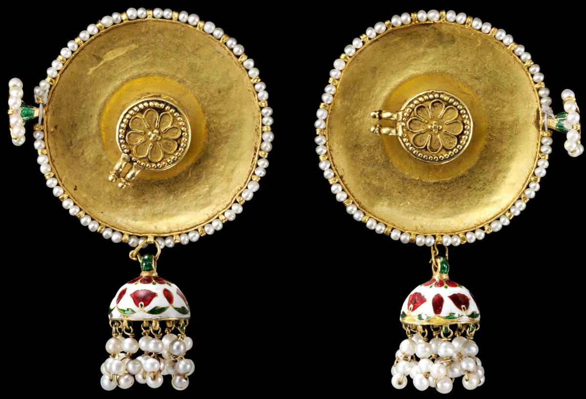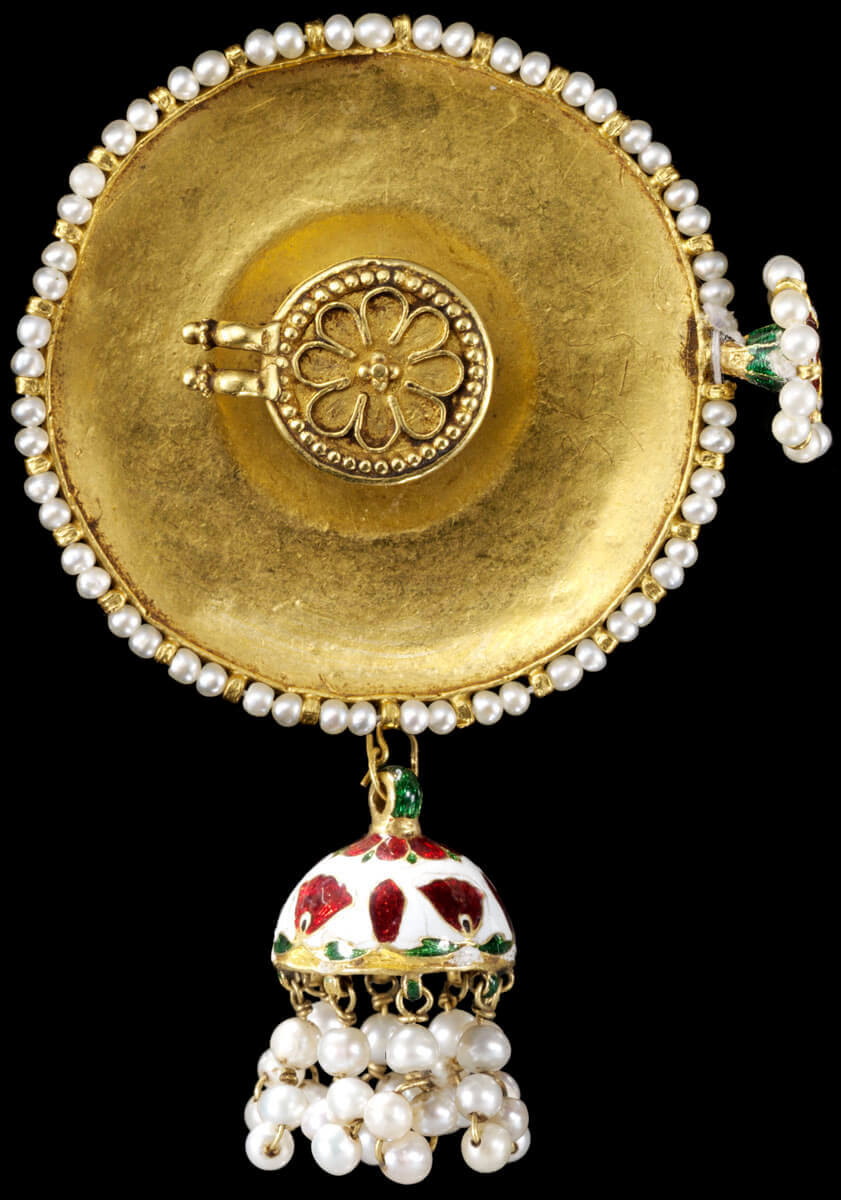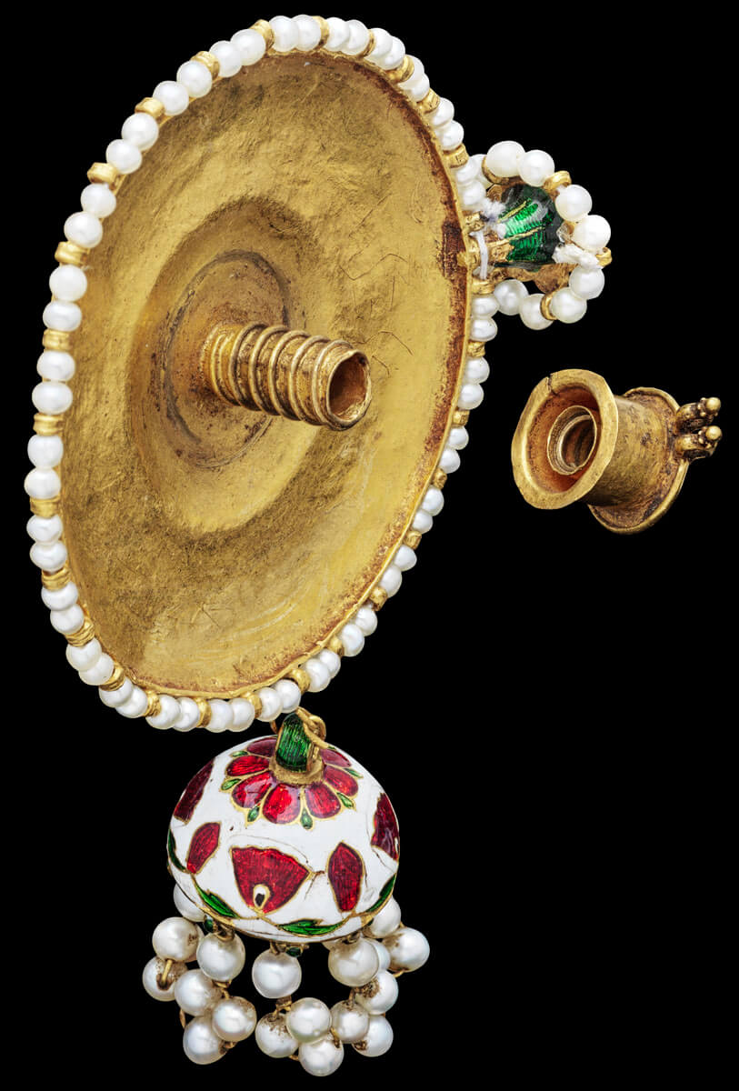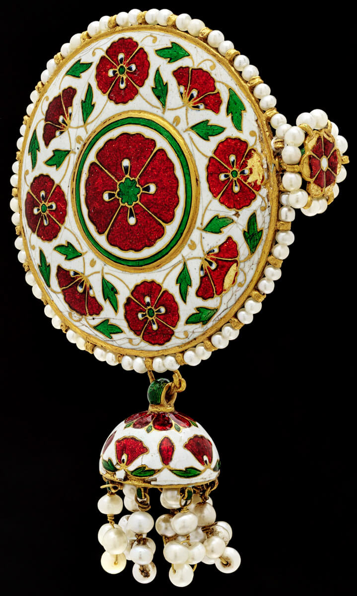 مصنوع من الذهب، ومطلي بالمينا، وخيوط من الذهب تنتظم فيها حبات من اللؤلؤ.