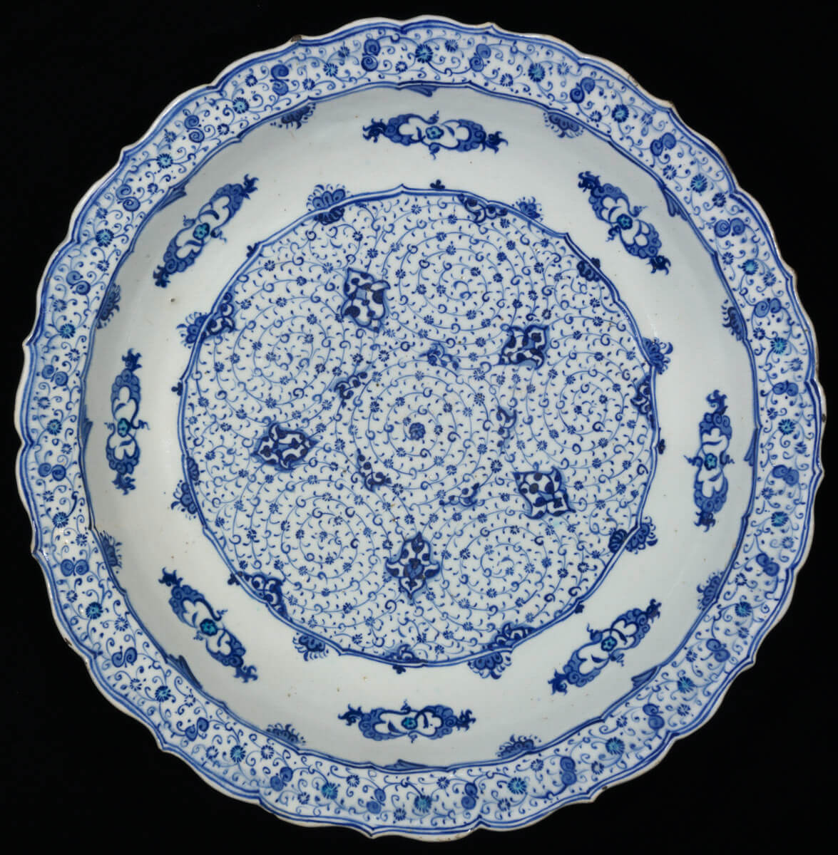 Composite-bodied ceramic dish with dense foliated scrolls, stylized palmettes and Chinese-style cloud devices