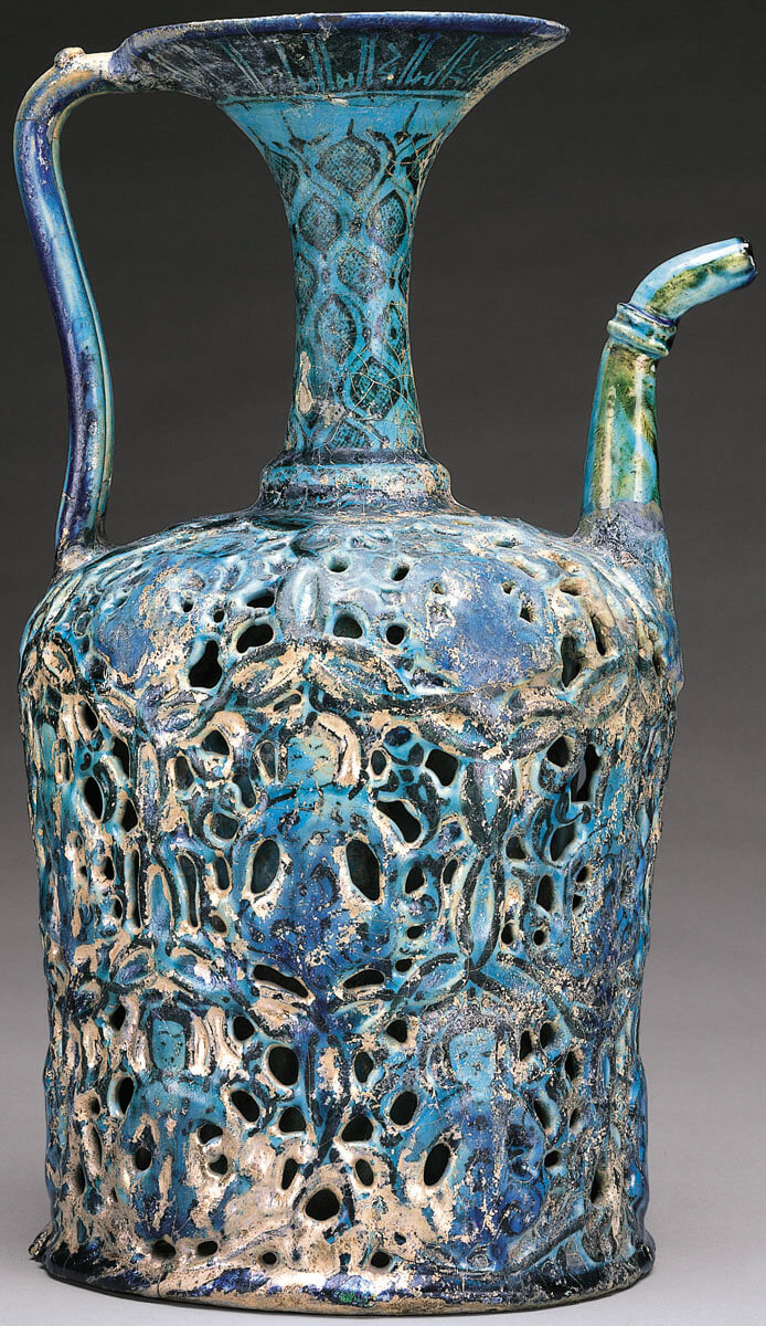 Wheel-thrown and moulded, pierced, underglaze-painted in black, transparent turquoise glaze detailed with cobalt blue