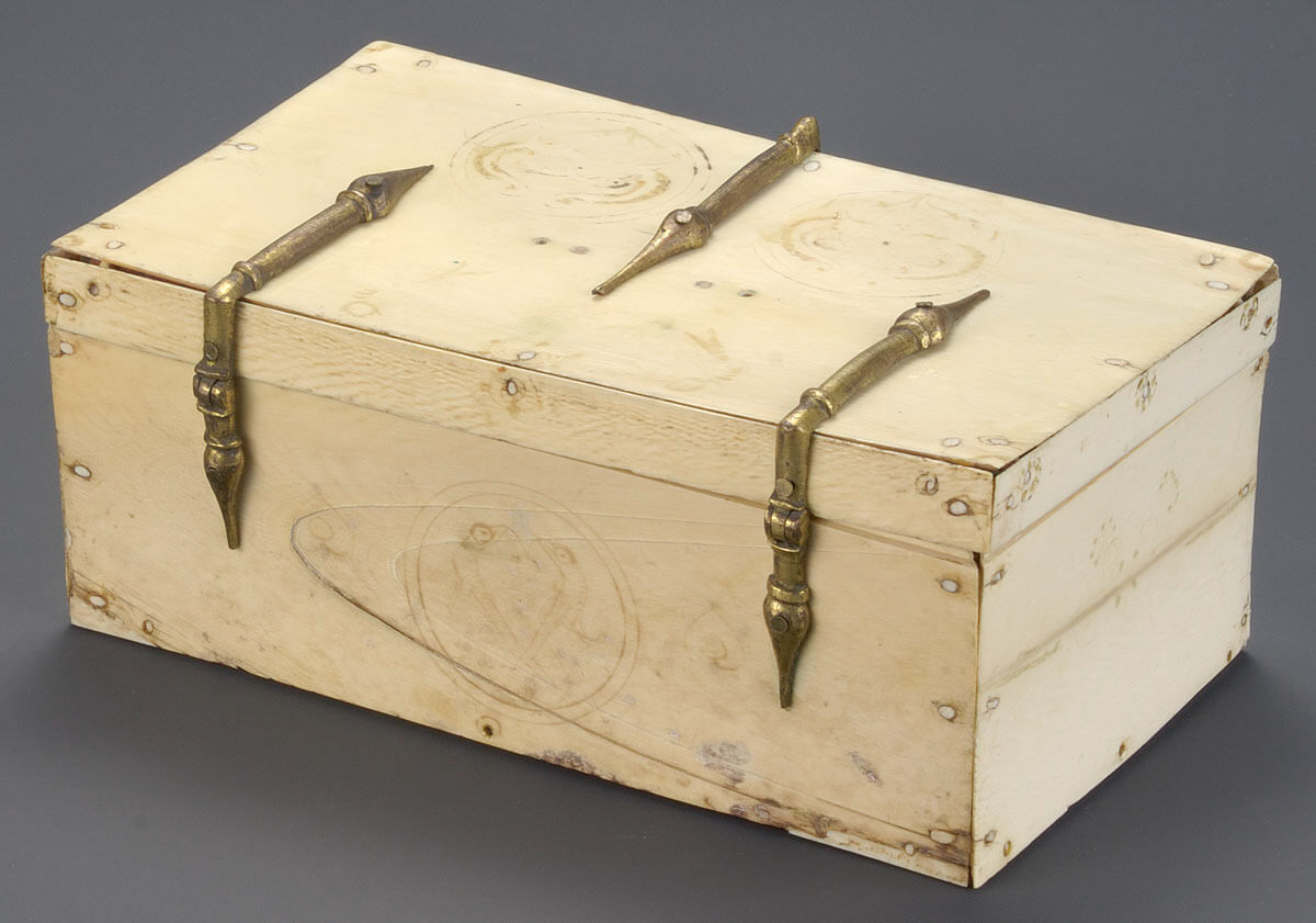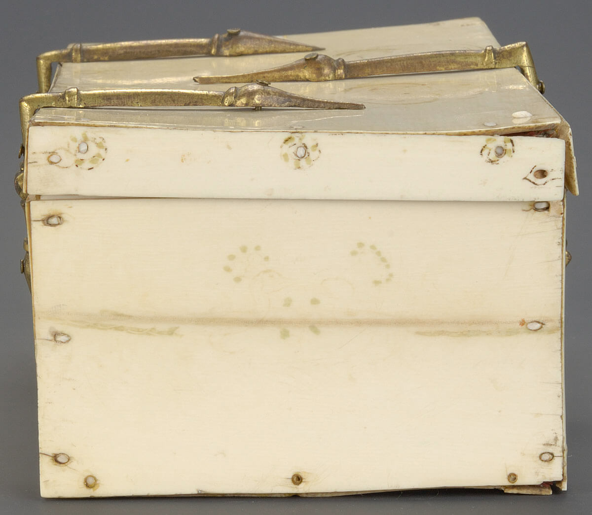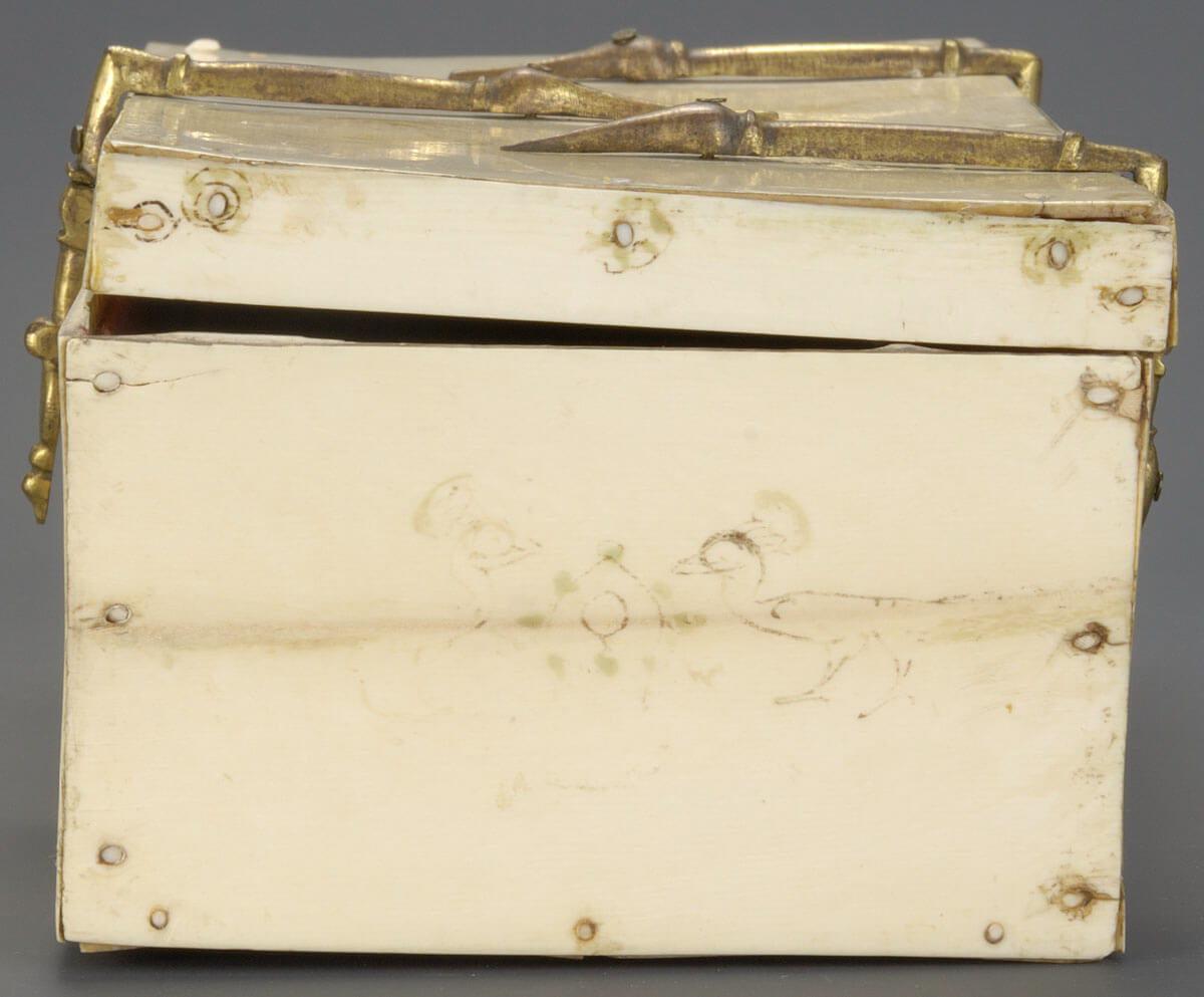 Elephant tusk slabs with ink, paint, gold leaf, gilded bronze mounts