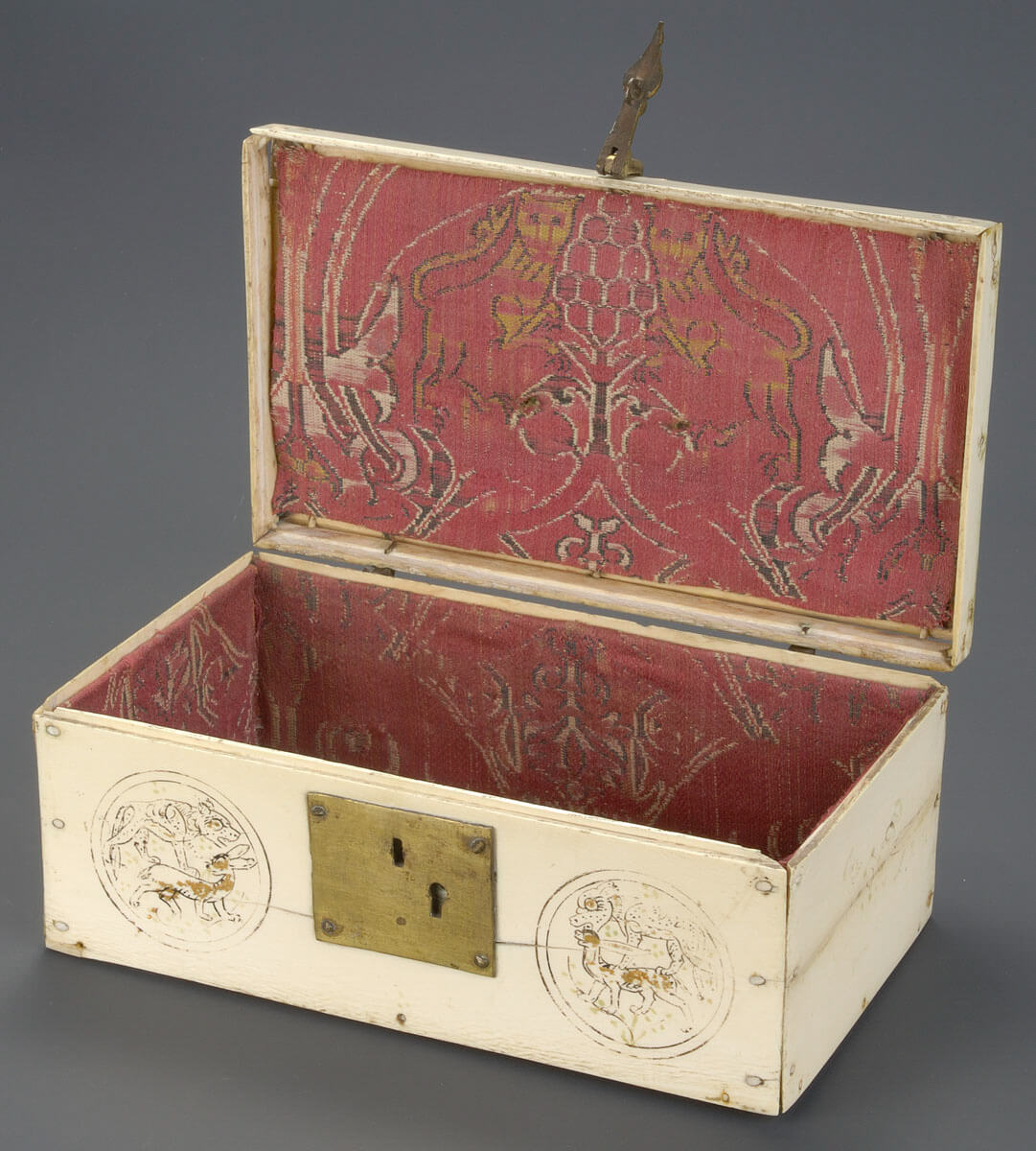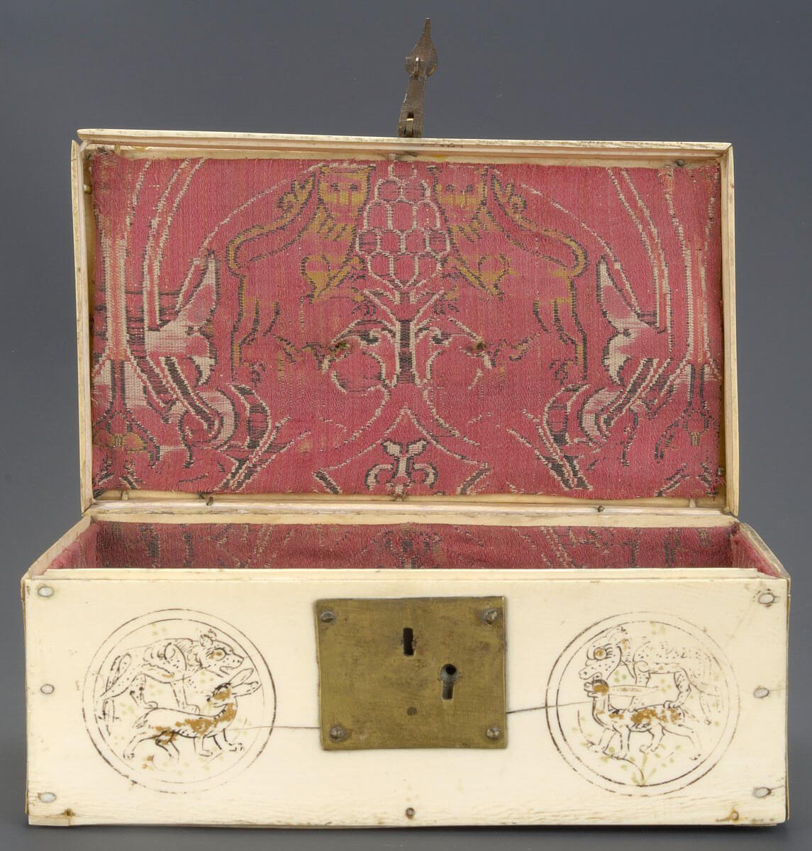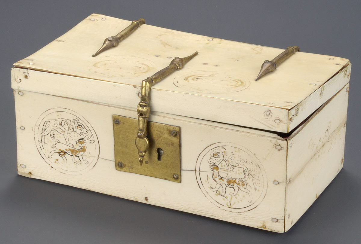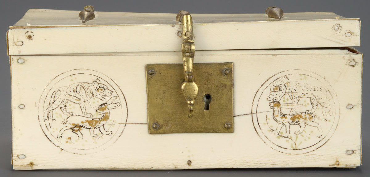 Elephant tusk slabs with ink, paint, gold leaf, gilded bronze mounts