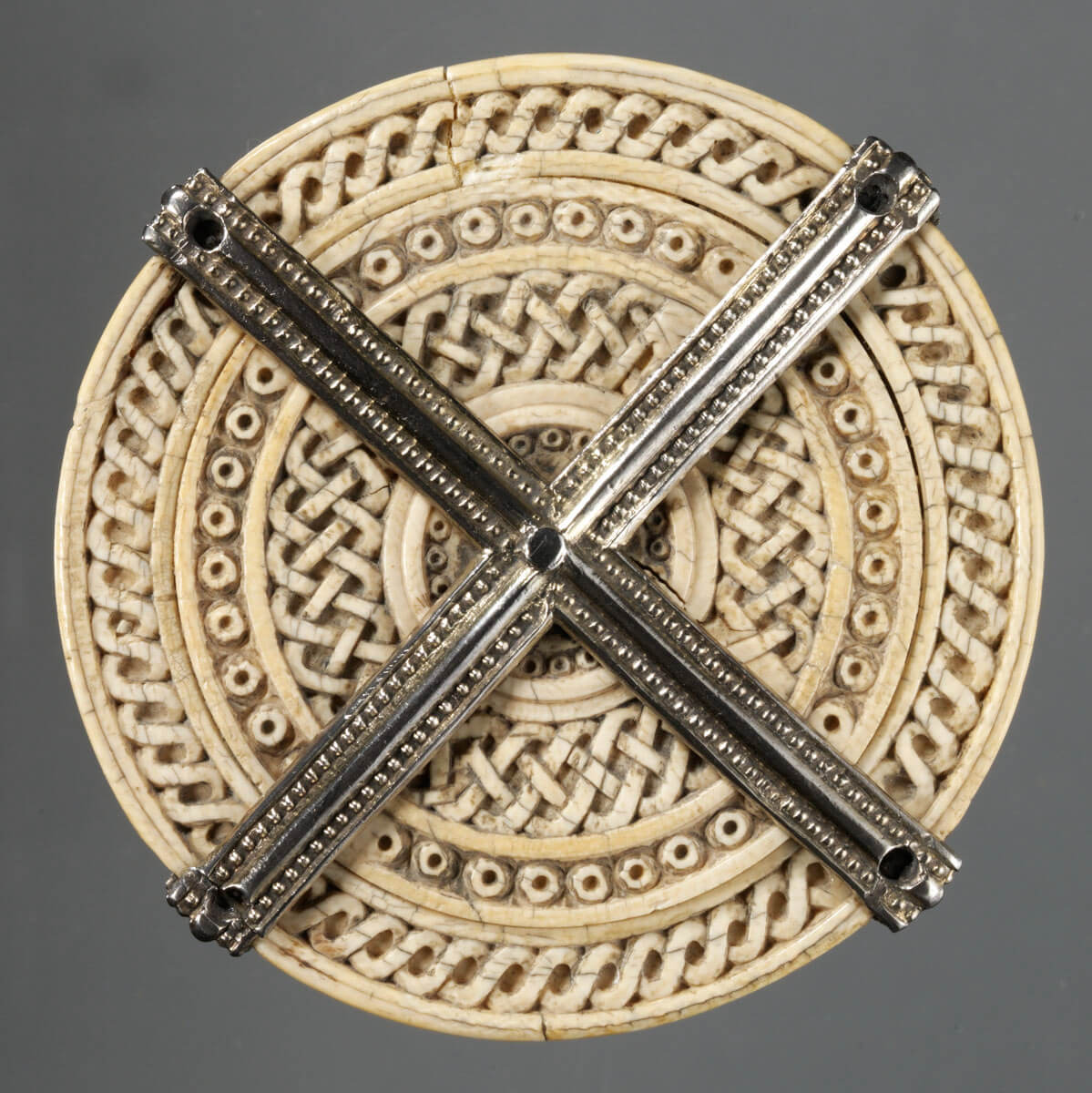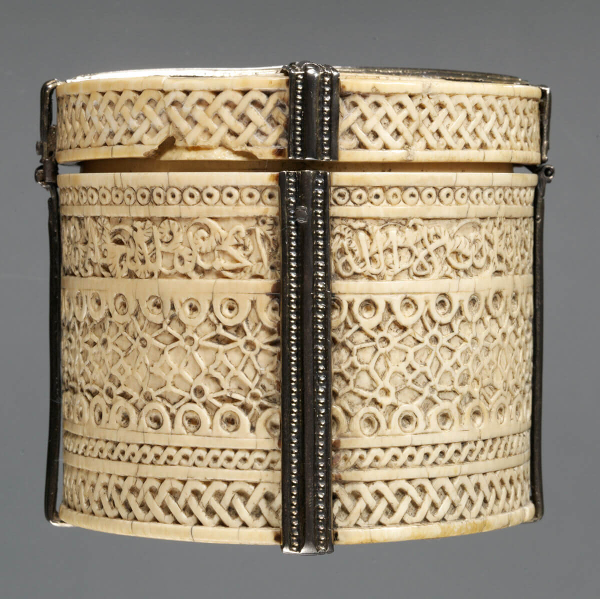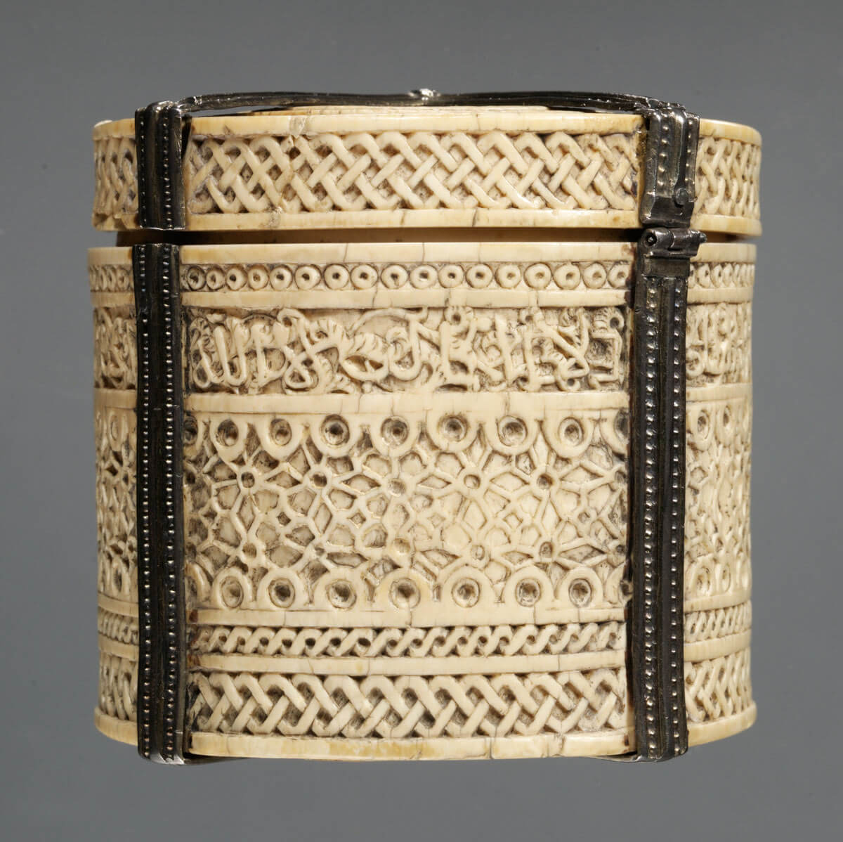 Ivory lidded box with guilloche borders, geometric pattern and naskhi inscription