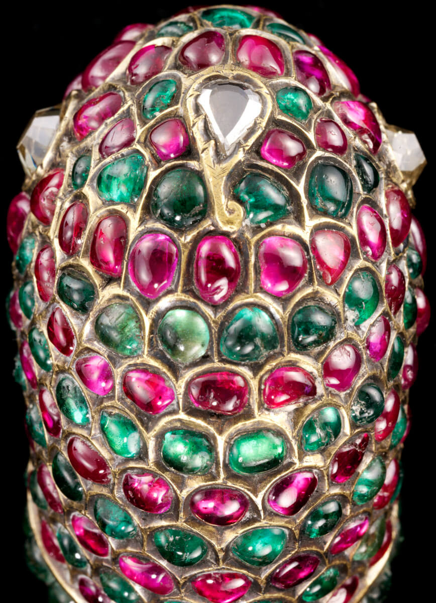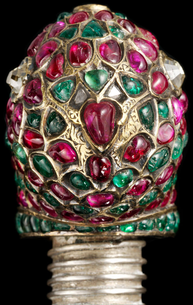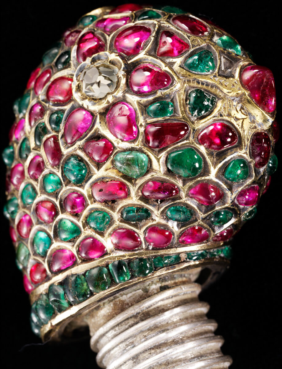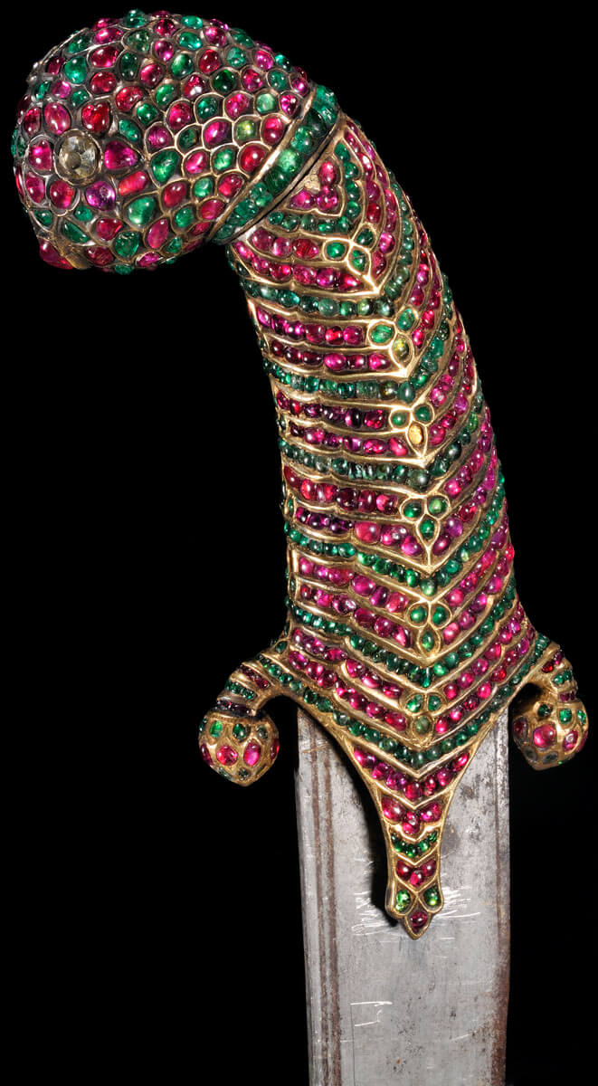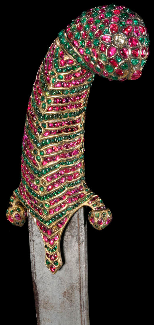 Pattern-welded steel blade; hilt gold over iron, kundan technique, set with gemstones
