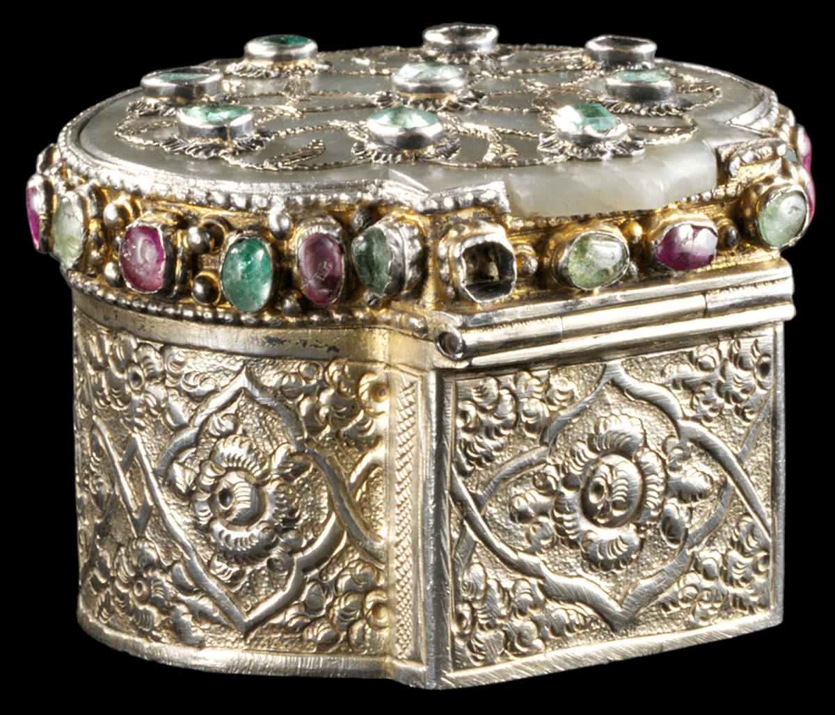 Silver repoussé box gilded; nephrite plaque engraved, inlaid with gold and set with stones