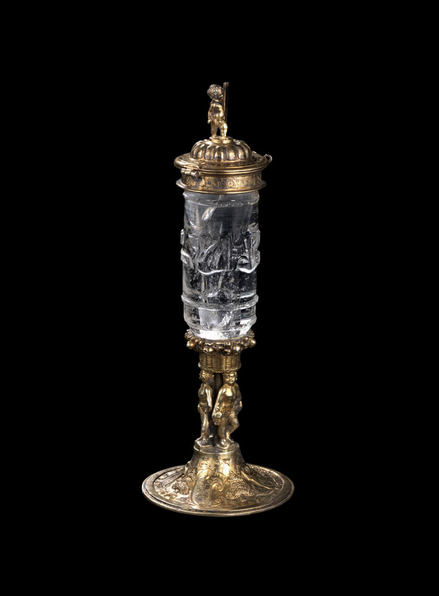 Cut, ground and polished by lapidary means; silver mounts cast, fabricated, engraved and gilded