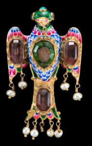 Gold pendant in form of bird of prey, enamelled and set with stones and pearls
