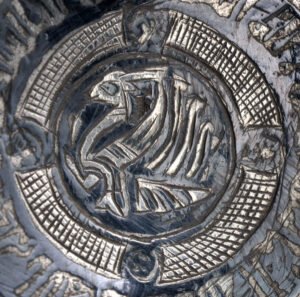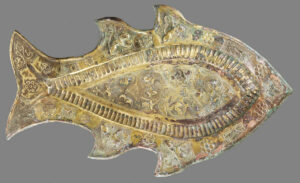 Bronze dish in the form of a fish, decorated with winged lions, hares and arabesques