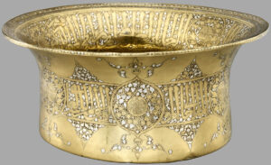 Brass basin inlaid with silver, thuluth inscriptions praising officer of al-Malik an-Nasir Muhammad