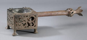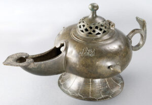Bronze oil lamp with plait design, leaf spout and Kufic inscription ‘Blessing and happiness’