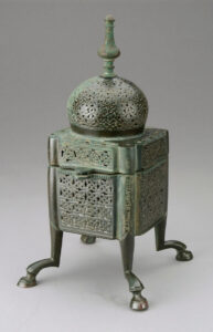 Bronze incense burner, domed body, quadruped feet, Kufic inscription blessing Abi Ishaq