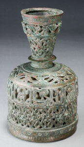 Bronze reticulated double-walled bottle with half-palmette scrolls and Kufic inscriptions