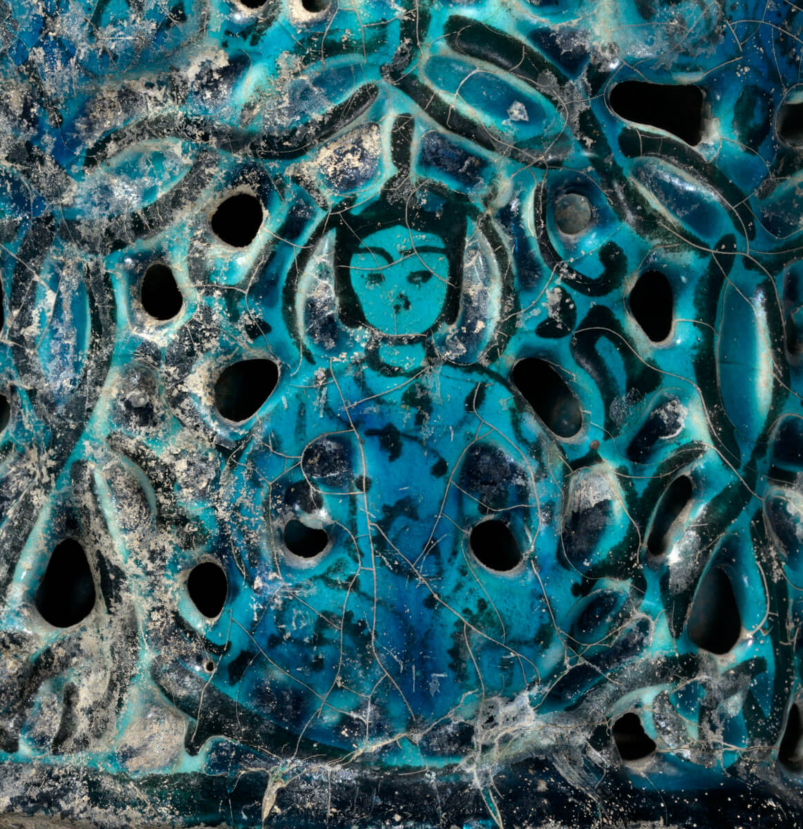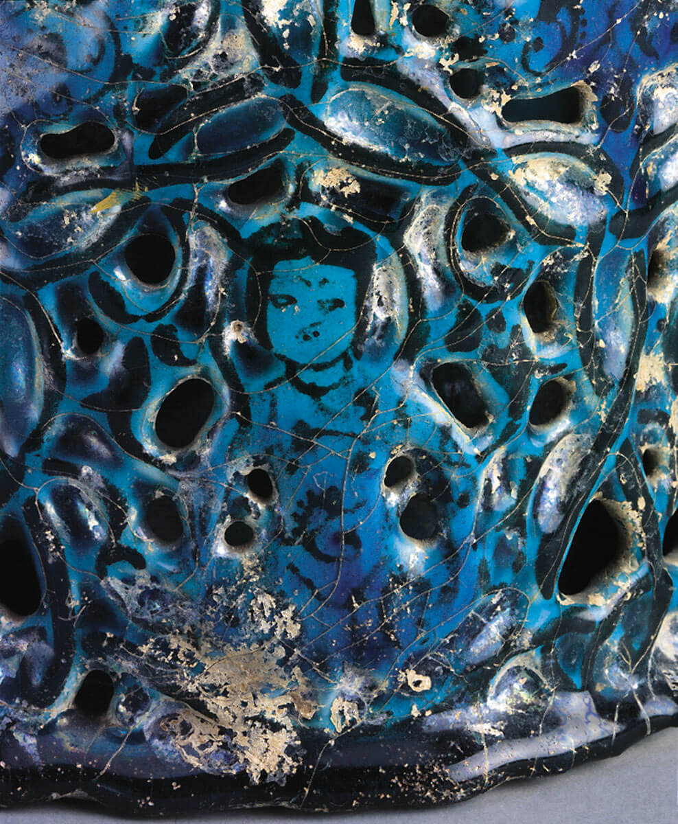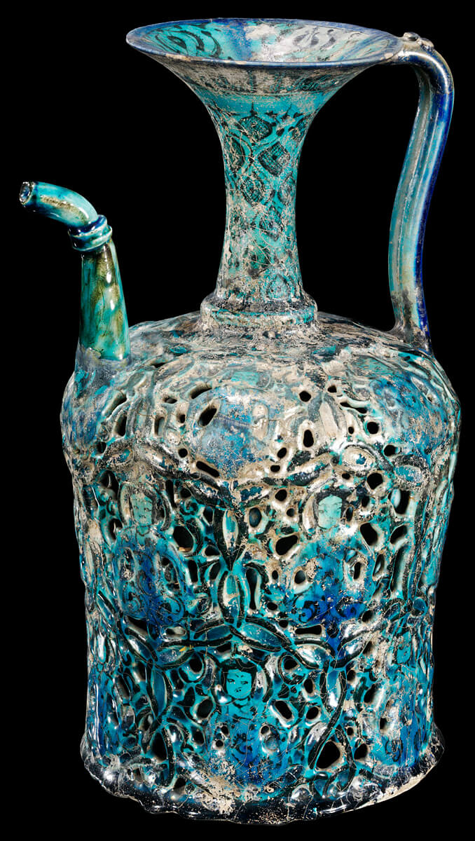 شكل بالقالب والدولاب، وُثقبت الزخارف وُرسمت باللون الأسود تحت التزجيج الفيروزي الشفاف، وُكسيت التفاصيل باللون الأزرق الكوبالتي.