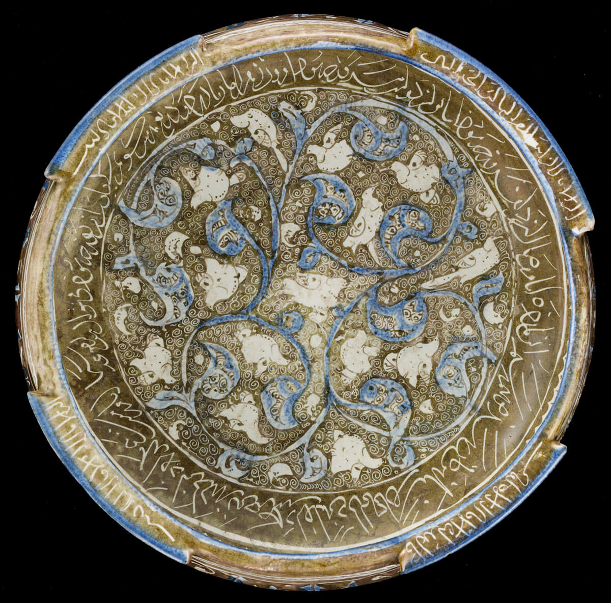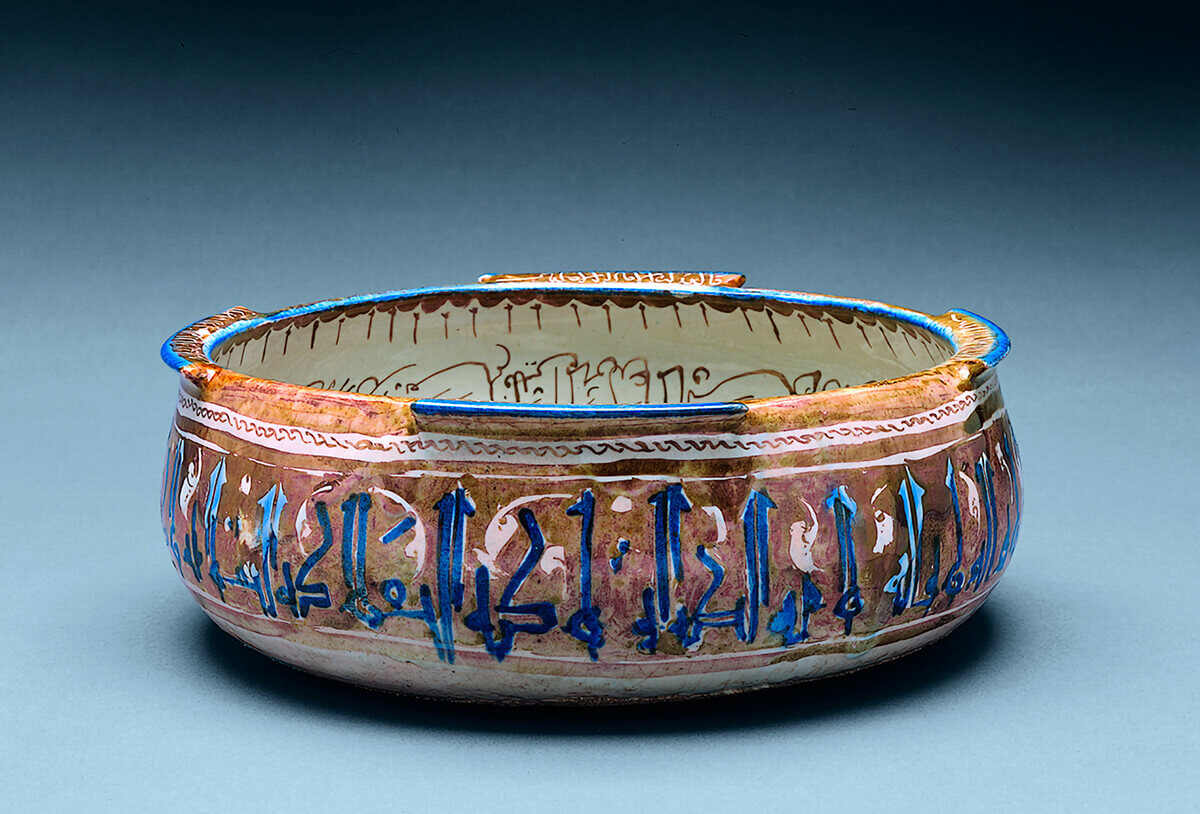 شكلت بالدولاب، وُرسم عليها بألوان البريق المعدني والأزرق الكوبالتي فوق طلاء تزجيج أبيض معتم.