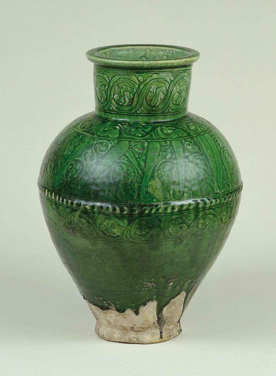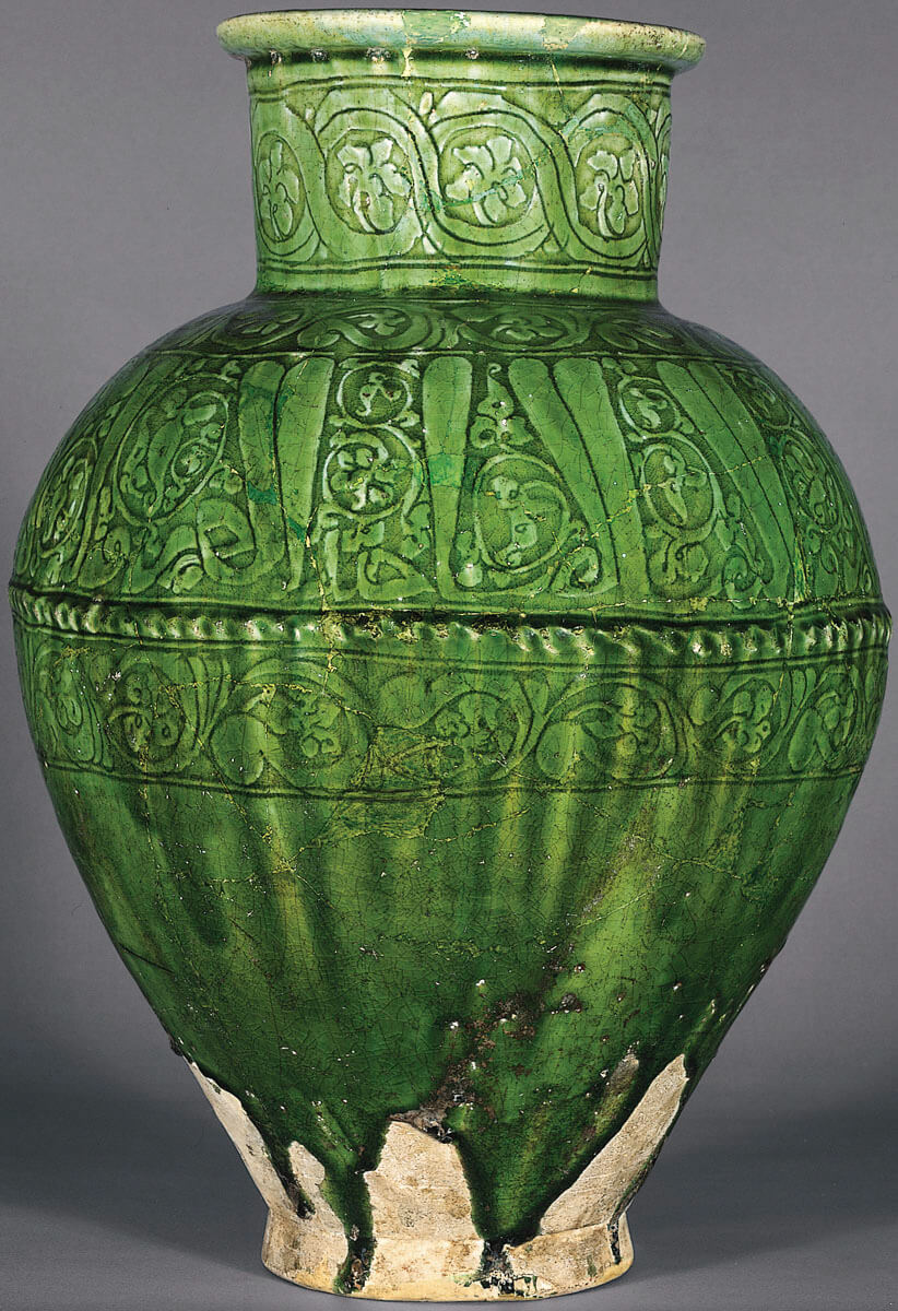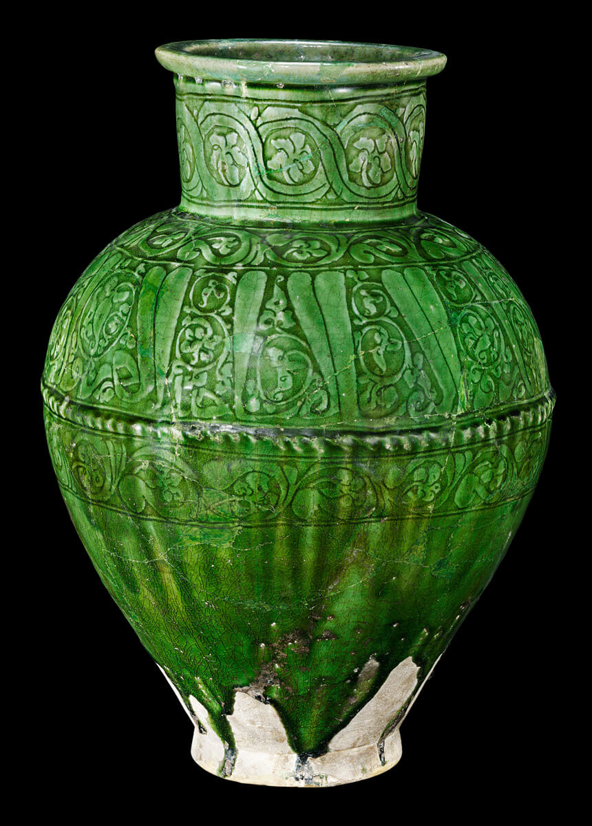 شكل بالدولاب، عليها حفر بارز، وطلاء تزجيج أخضر شفاف.