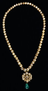 عقد من الذهب والألماس، تتدلى منه خرزة من الزمرد؛ العناصر التي تشكل السلسلة مطلية من الخلف باللون الأخضر، بينما ظهر