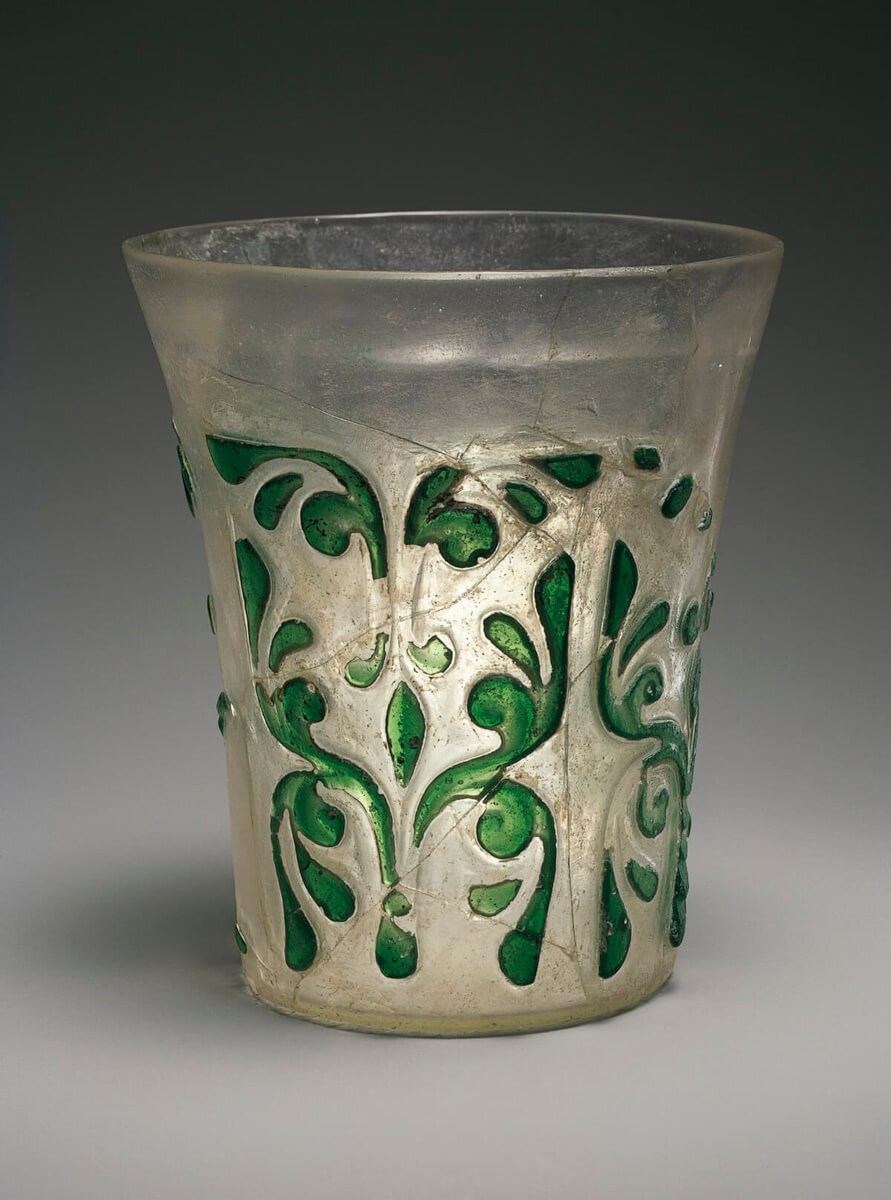 شكل بالنفخ، ثم غمر في زجاج مذاب أخضر، ونقش عليه بالحز بإستخدام أدوات حفر وزخرفة الأحجار الكريمة.