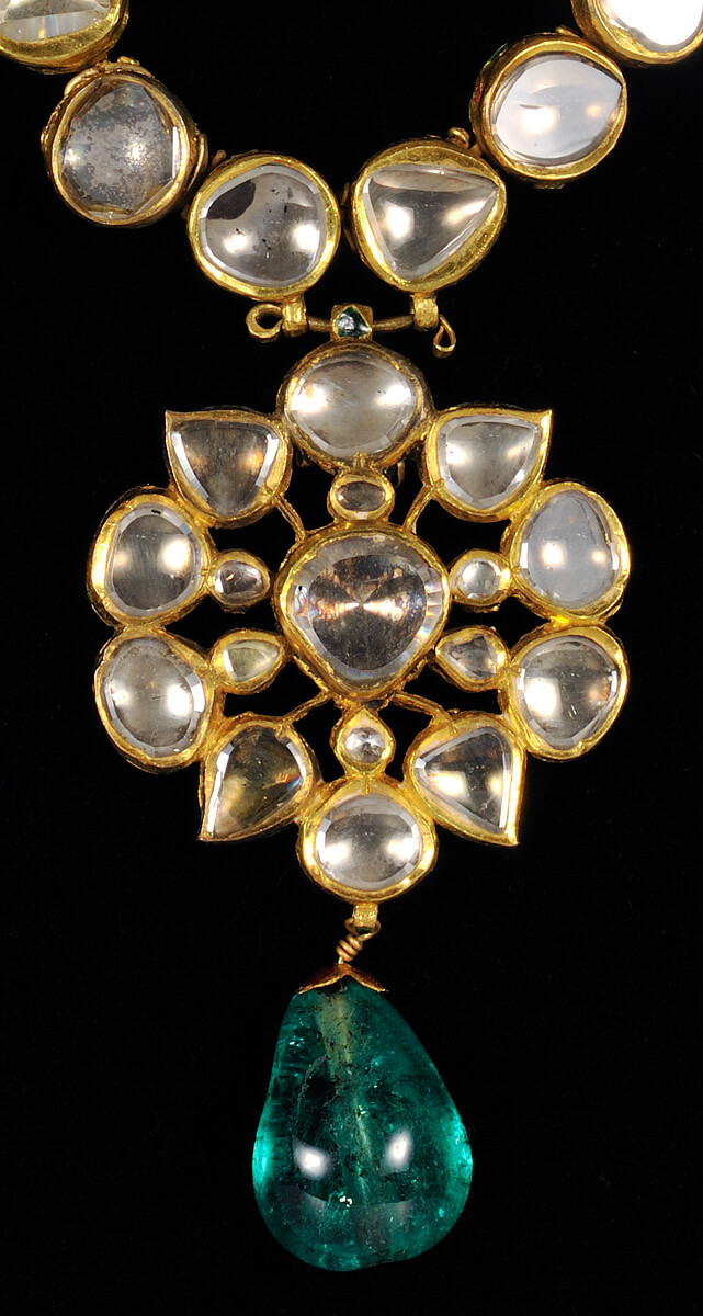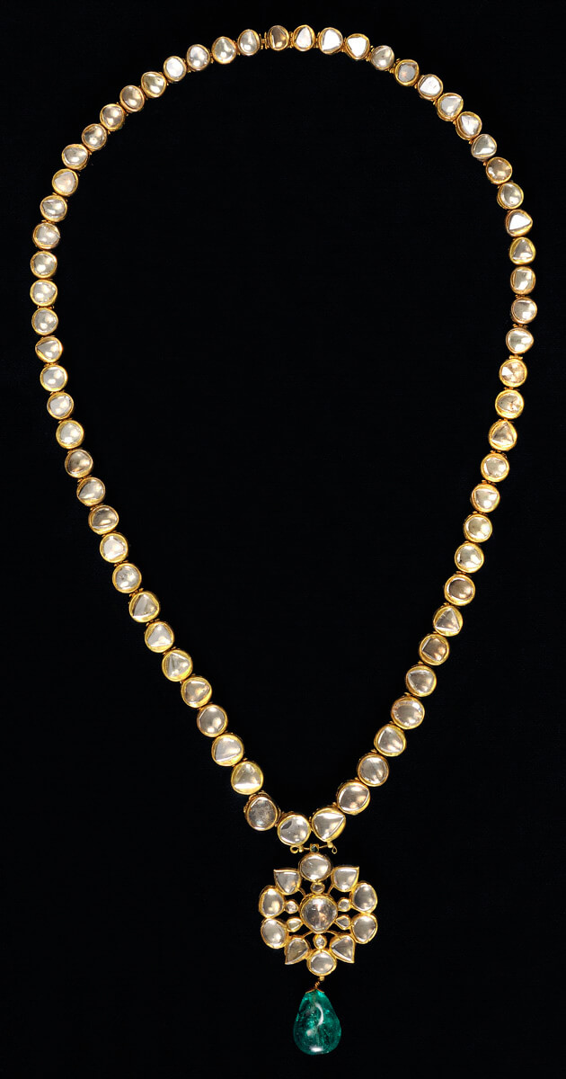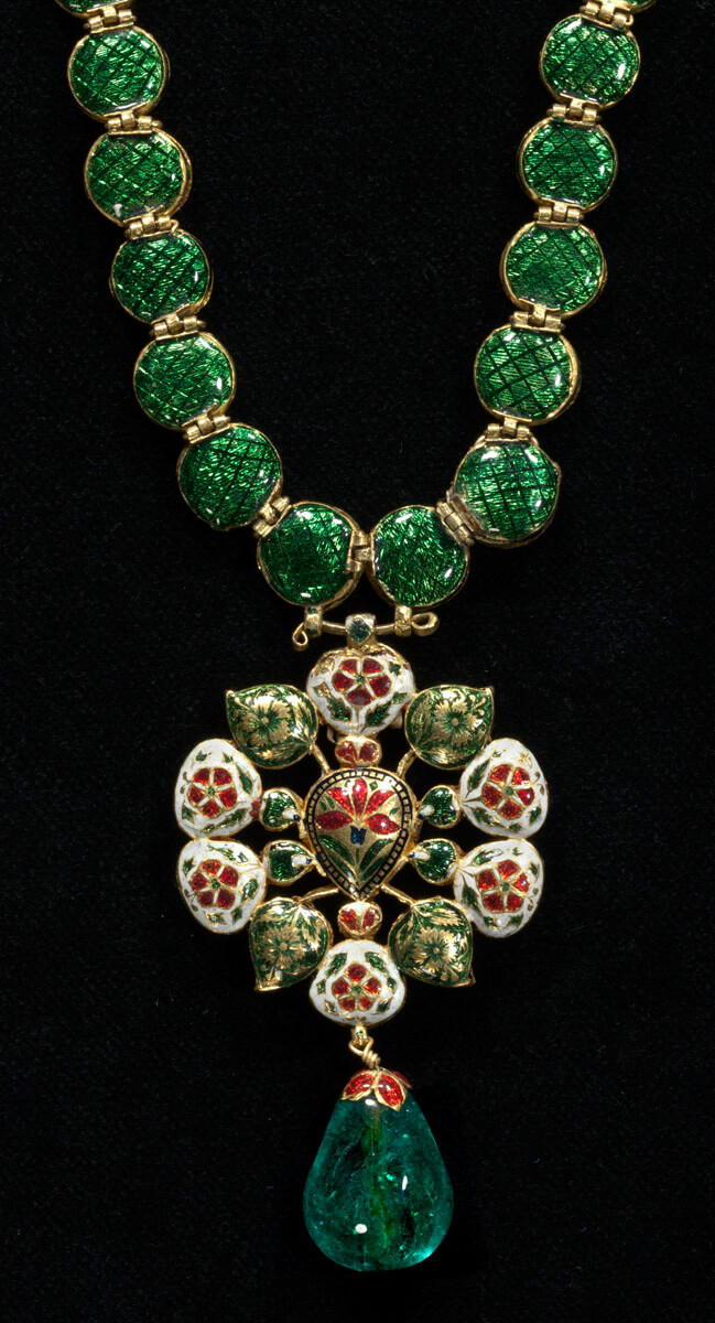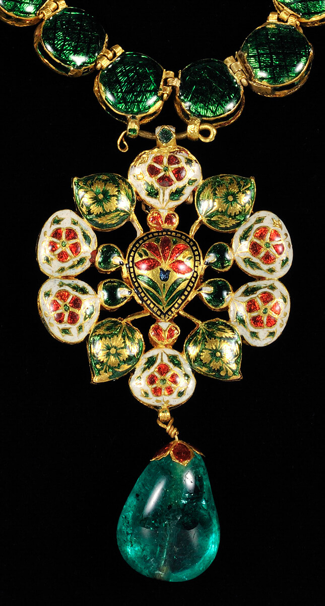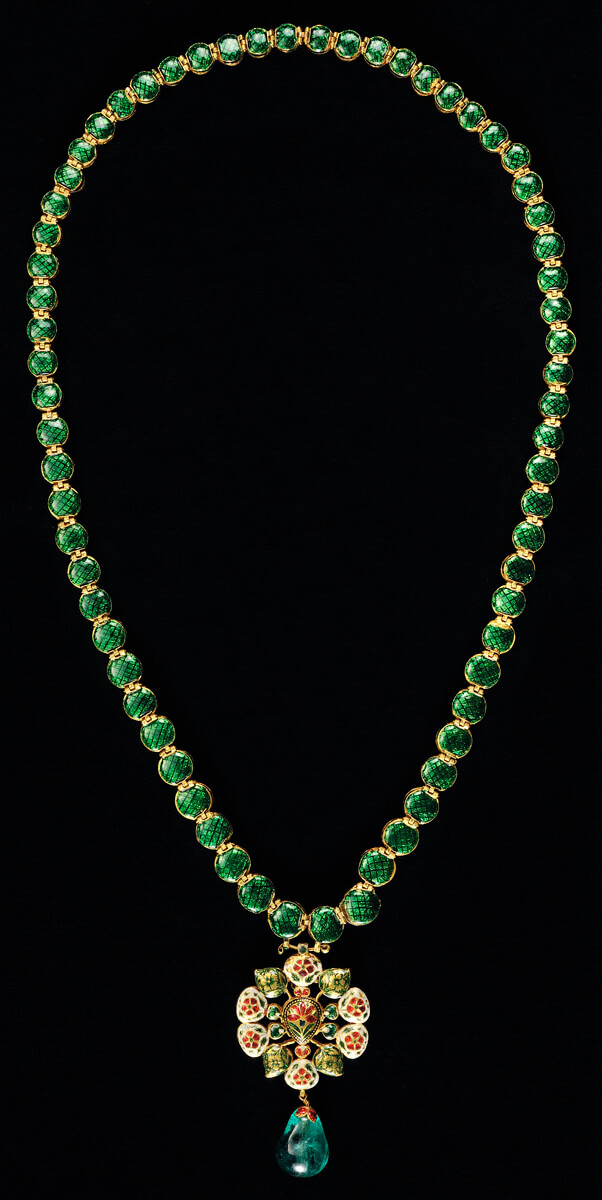 مصنوع من الذهب ومرصع بأحجار كريمة، وظهُره مطلي بالمينا بتقنية “شامليفيه”، وتم نحت ونقش وصقُل أحجار العقد بأدوات الصاغة.