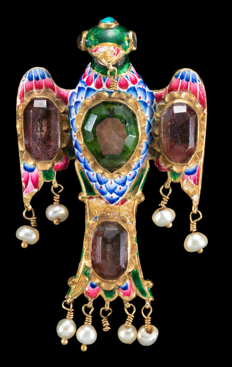 مصنوعة من صفيحة وسلك، ومطلية ومركب عليها أحجار شبه كريمة