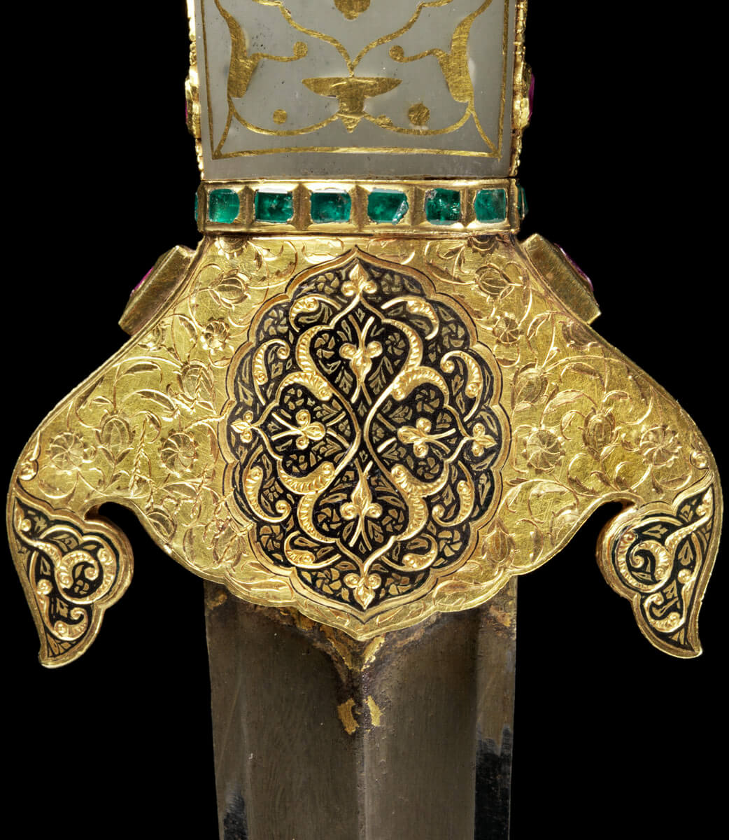 النصل من الجوهر، وتَّم شحذه وصقُله مع بعض الحزوز؛ المقبض والغمد من يشب، محفور، ومصقول، ومثقوب بأدوات الصاغة، ومط ّعم بالذهب، ومر َصع بأحجار كريمة؛ والواقية مصنوعة من صفيحة سميكة منقوشة، والمطعم بمادة عضوية سوداء، ومر َّصعة بأحجار كريمة.