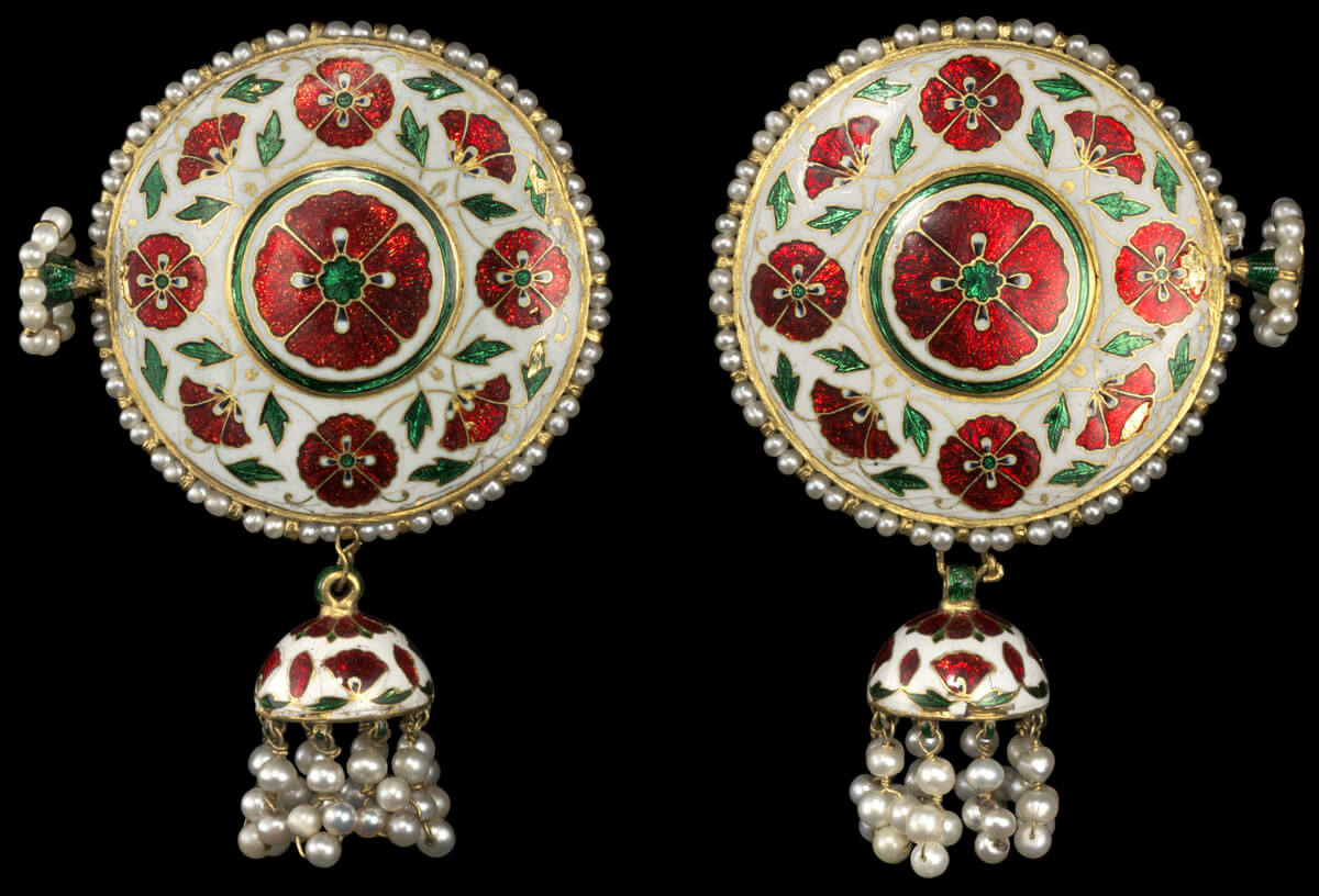 مصنوع من الذهب، ومطلي بالمينا، وخيوط من الذهب تنتظم فيها حبات من اللؤلؤ.