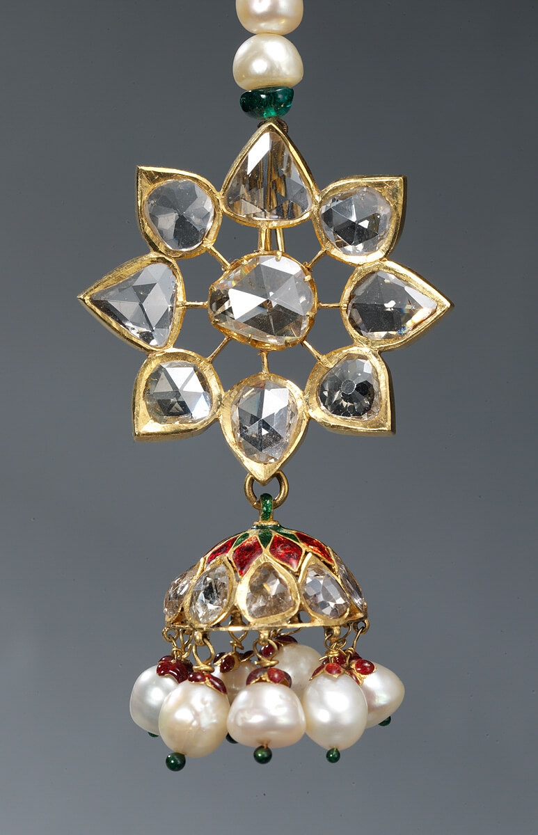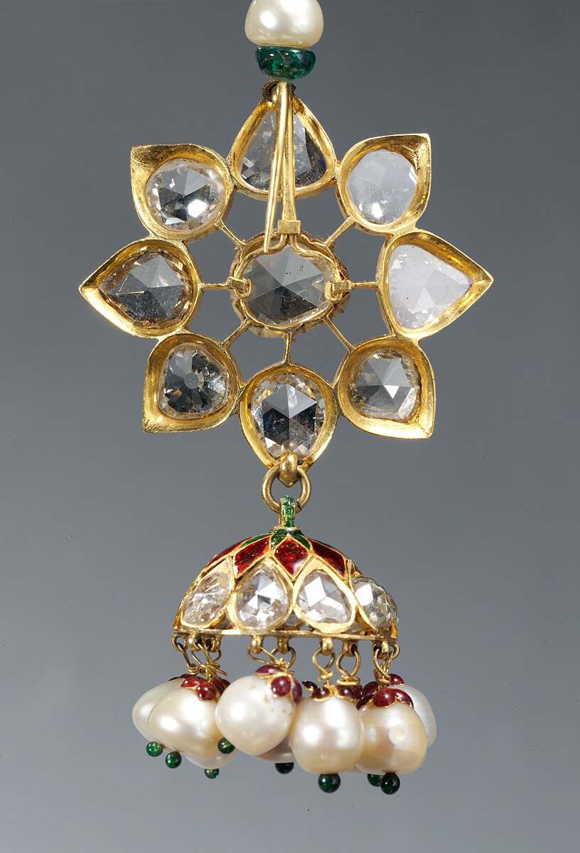 مصنوعة من الذهب، ومر َّصعة بأحجار كريمة ومطلية بالمينا؛ تنتظم حبات اللؤلؤ والزمرد في خيط من الحرير، أما اللؤلؤ، المعلق بالعنصر المقَّبب، فينتظم في سلك من الذهب.