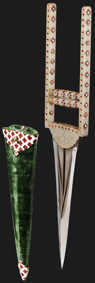 المقبض من النفرايت المحفور، والمصقول والمنقوش بأدوات الصاغة، ومز َود بتعزيزات من الحديد، ومطعم بالذهب بتقنية “كندن”، ومر َّصع بالأحجار الكريمة.