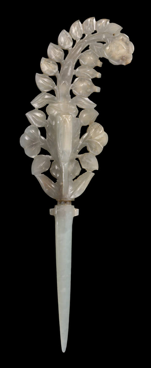 حجر النفرايت (أحد أنواع اليشب) منقوش ومصقول ومحفور بأدوات الصاغة، ومطعم بالذهب ومرصع بالأحجار الكريمة بتقنية “كندن”.