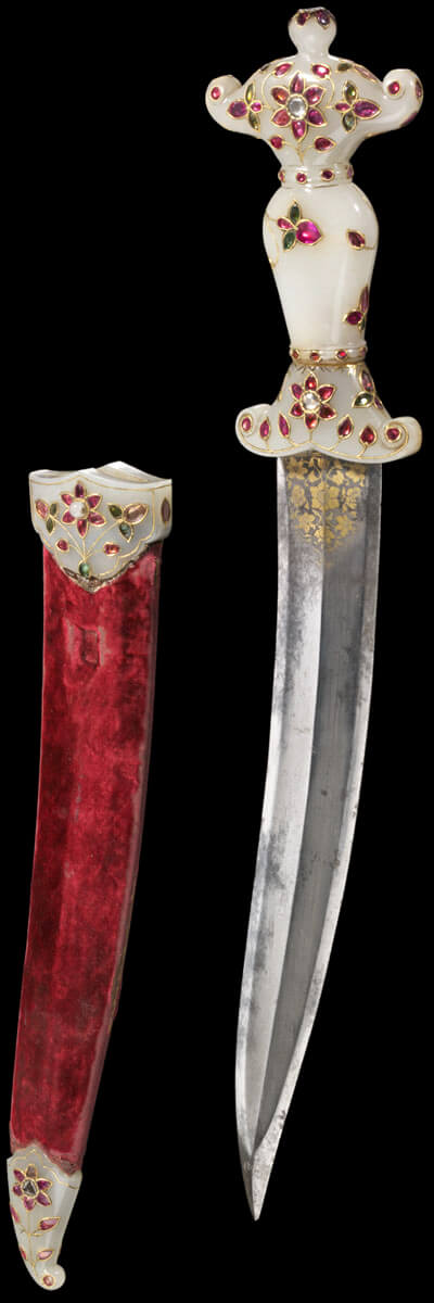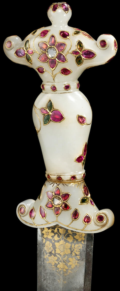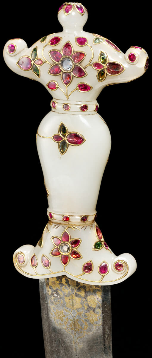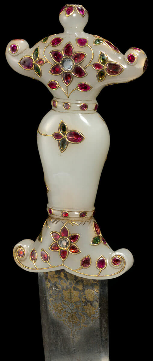 المقبض من اليشب،تَّم حفُر وصقُل السفن والنعل بأدوات الصاغة، ثم ُنقشا بالذهب ورصعا بالأحجار الكريمة؛ أما النصل فمن فولاذ الجوهر،تَّم شحُذه وصقُله، وُنفذت عليه حزوز سطحية، وترخيم وكساء من الذهب؛ والغمد الخشبي مغطى بالمخمل وزّين نعله وسفنه باليشب.