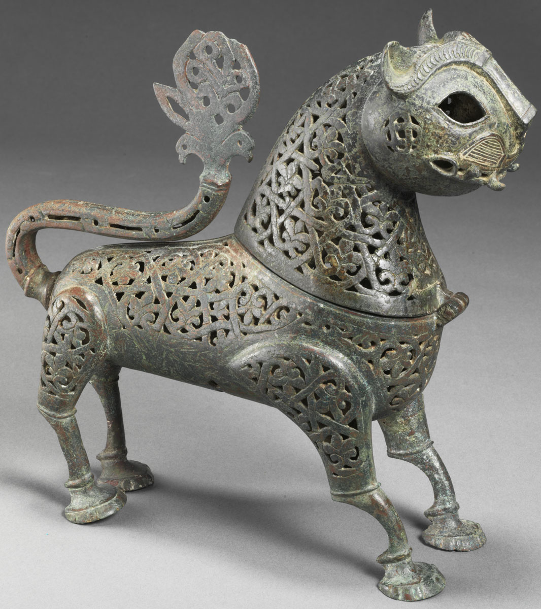 شكلت بالقالب لتضم فتحات وحفرت عليها النقوش، العينان مرصعتان بخزف مزجج بلون فيروزي فاتح.