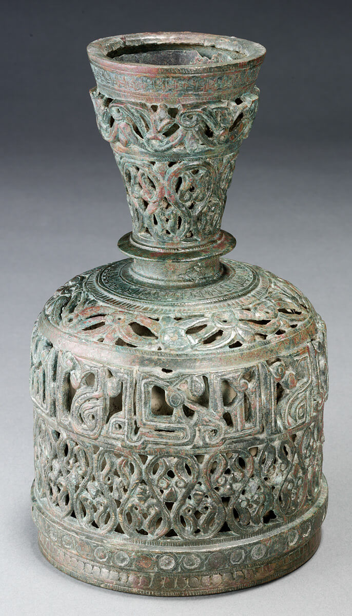 شكلت بزخارف شبكية ونفذ عليها الحفر ثم ادخلت فيها القنينة الداخلية، أما القاعدة فتم لحامها.