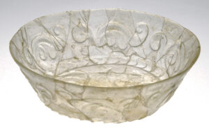 سلطانية من الزجاج. نفذ على سطحها الخارجي حفٌر بارز مشطوف لسلسلة من أنصاف مراوح نخيلية. ويظهر في القاع كائن مجنح