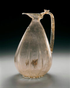 سنجد هنا مثالا رائعا، من المشغولات الزجاجية ،منها وعاء أخميني عديم اللون، يعود إلى ما بين القرن السادس إلى الخامس قبل الميلاد، ويبين التصميم على شكل زهرة اللوتس والأوراق نظرة على الحرف التالية، كما ستعطينا فكرة لما ستكون عليه المشغولات الزجاجية لألف سنة أخرى.