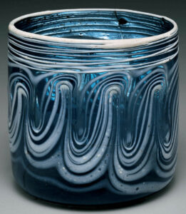 قدح زجاجي عديم اللون، نقش عليه عناصر نباتية متكررة بتقنية الحفر النافر باللون الأخضر الشفاف.
