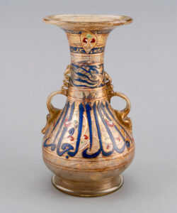 حامل من الزجاج المطلي، عليه شعار نبالة مملوكي (قوس وسهمان لبندقدار)، ورسوم لأزهار اللوتس الصينية، وطيور العنقاء، وأشرطة تصور حيوانات