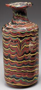 قارورة من زجاج شفاف أرجواني اللون، نقش عليها تصميم من خطوط مسحوبة باللونين الأحمر والأصفر المعتمين، والأزرق اللامع والفيروزي (والأخضر