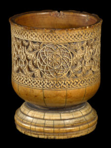 هاون من العاج، مزخرف بالحفر بشرائط مجدولة عند الحافَتين العلوية والسفلية. أما البدن، فتزينه أربع رصائع هندسية، على أرضية من