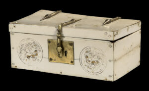 علبة من العاج، بها تركيبات من البرونز المذهب، وزخارف على شكل رصائع تضم في داخلها صوَر طيور متقابلة ومتدابرة، ومشاهد