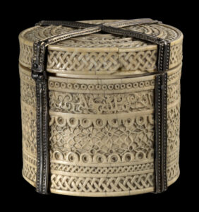 علبة من العاج، عليها نقش بالحفر البارز بُصور حيوان وحيد القرن، وطيور وأشكال نباتية؛ على حافة الغطاء، وجوه آدمية وذوات