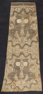 قصاصة من ثوب حريري، رسمت عليه دوائر في داخلها أزواج من أبي الهول، وعلى طول الحافة العليا تتكرر كلمة “العز”
